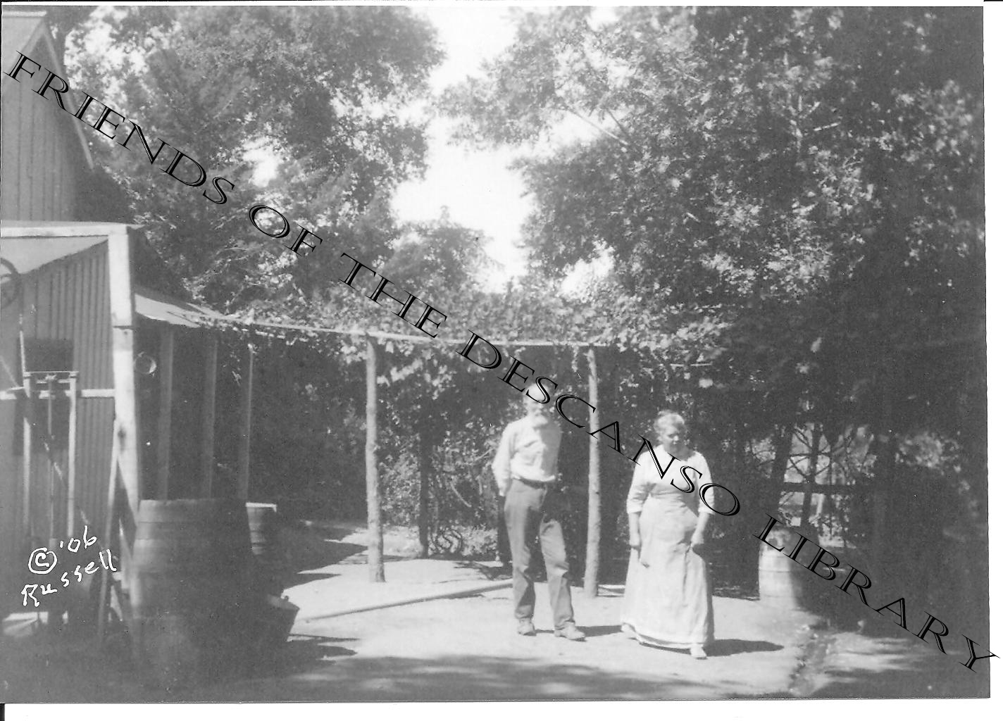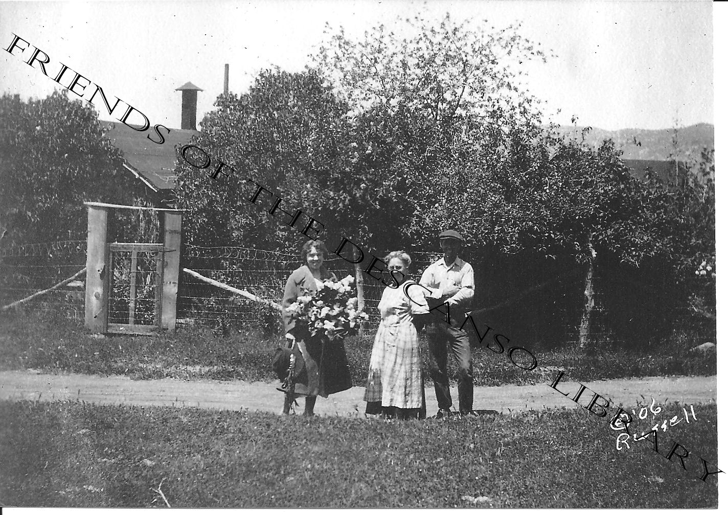 Flynn Ranch May 1923. Left to Right, Cora Russell, Mrs. Flynn, Mr Flynn at their ranch on Japatul Valley Road.