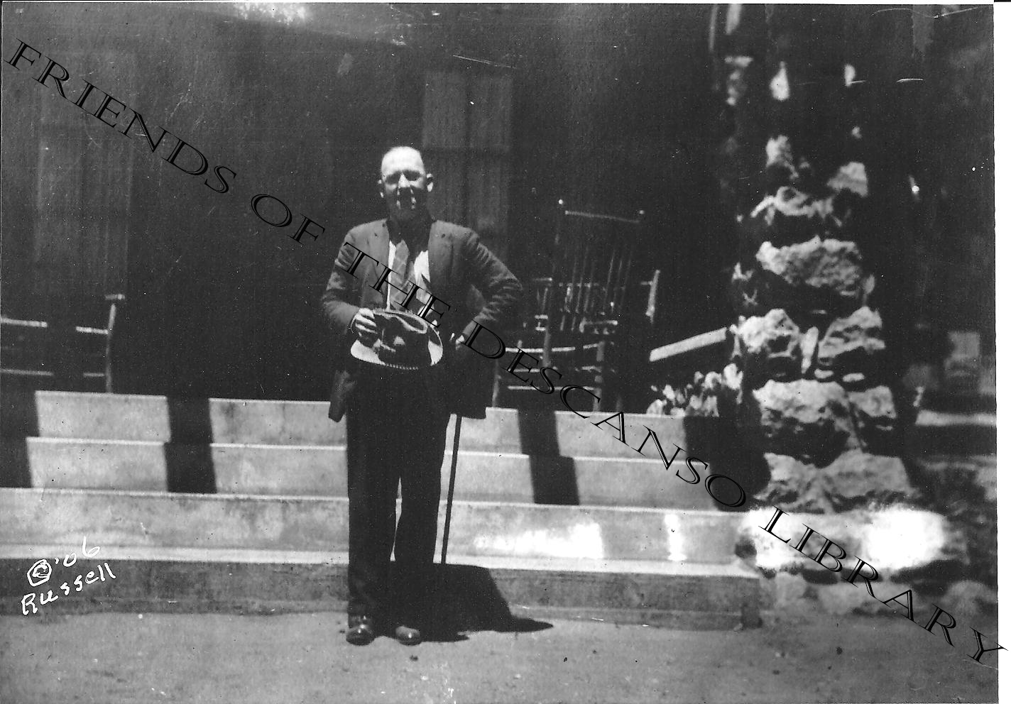 Jim Dorey on the steps of the Hulburd Grove Guest Ranch, 1925. Jim, at this time, is owner of what will later be Perkin's Store. During the early 1900's the Hulburd Grove Guest Ranch was what today would be classed as a five-star destination resort. Other Pictures of the resort are available.