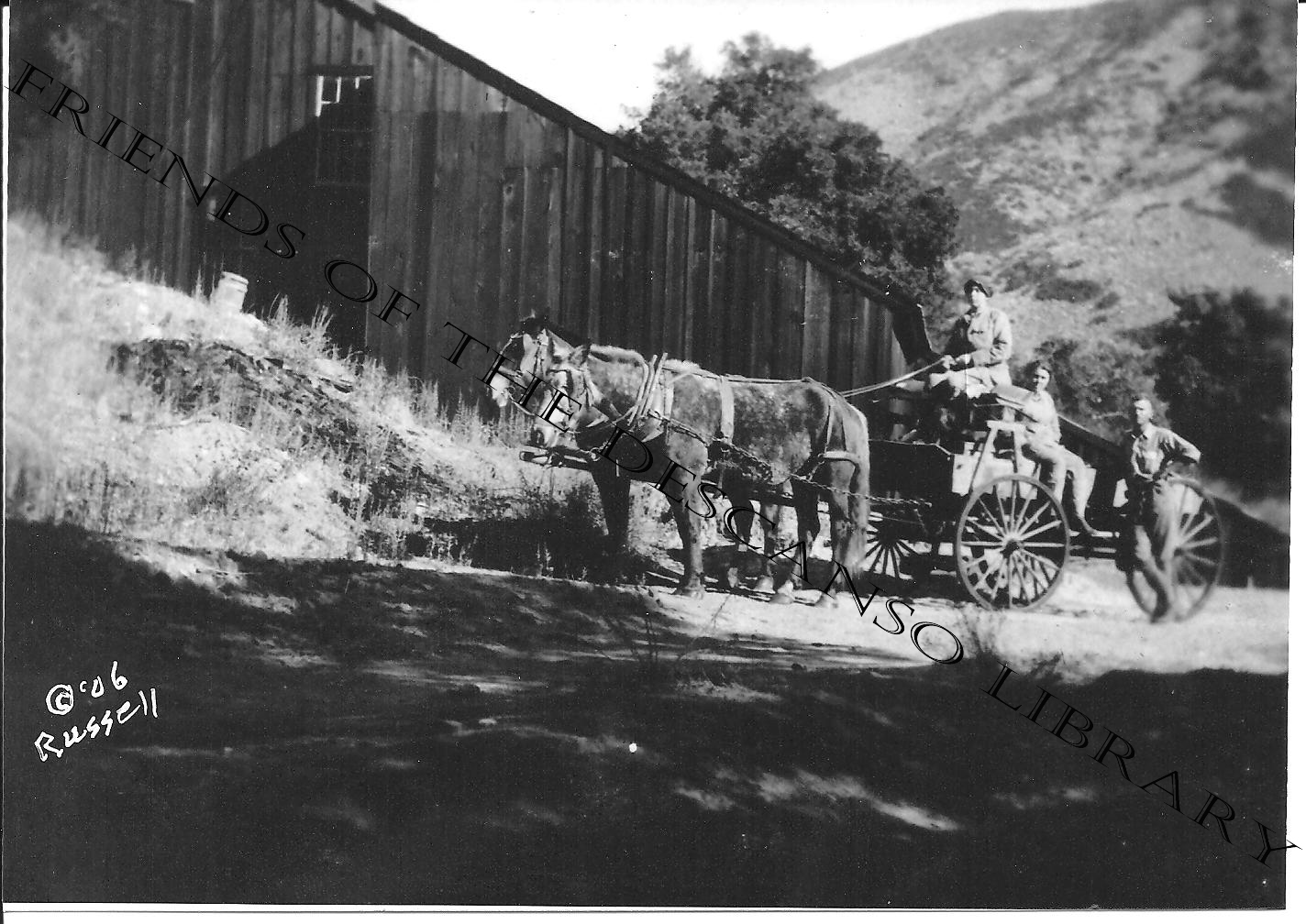Noble Mine, November 12, 1917. Cora Russell 'up' (colloquial: driving) the wagon. The mine was located in Pine Creek, north of present day Pine Valley. It was a producing gold mine and the actual location is now lost.