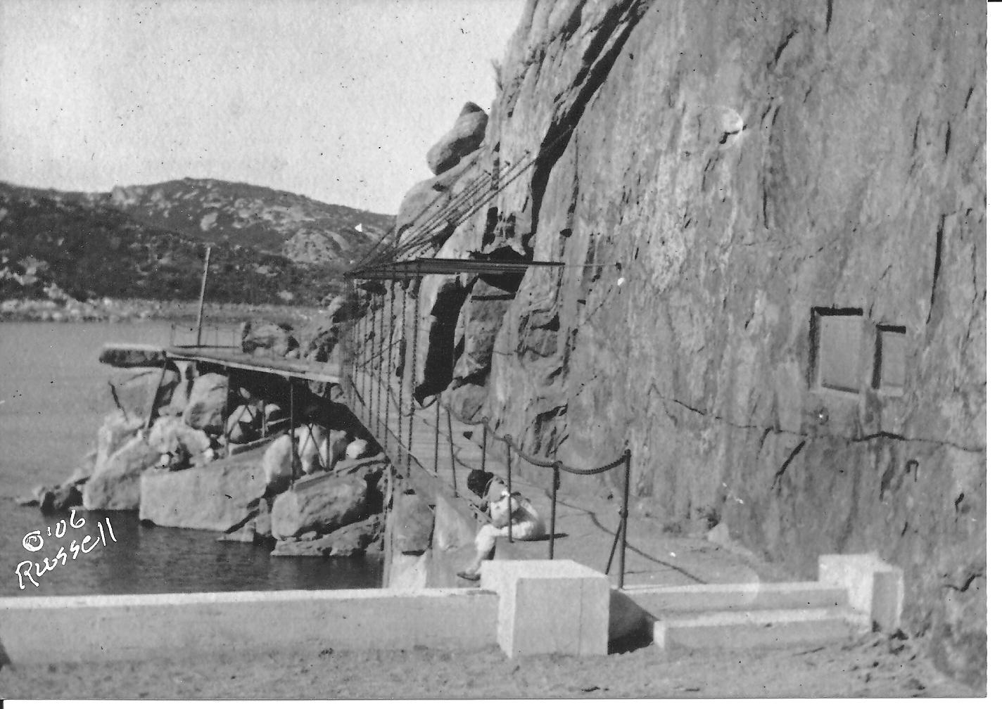 Lake Morina Dam, 1918. This is the catwalk to the dam at Lake Morina in the Campo area of San Diego County. The dam is part of the San Diego City water system. Other pictures of the dam are available. This lake was filled by Hatfield ("The Rainmaker") in 1914.