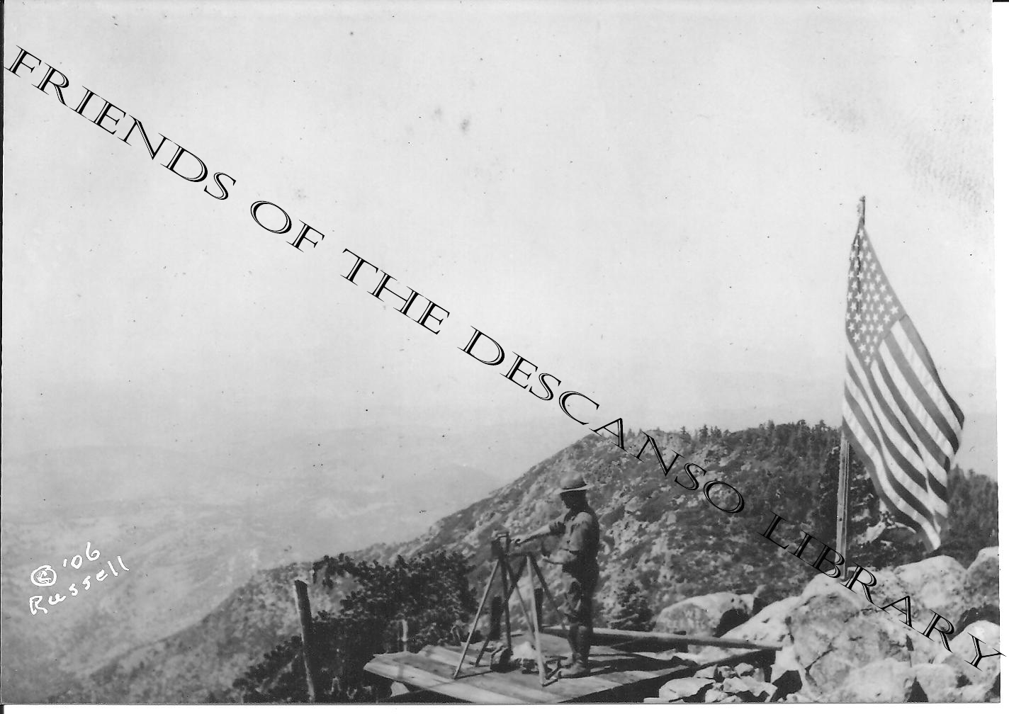 Heliograph Station for the Cuyamaca Lookout of the U.S. Forest Service in the Cuyamaca National Forest Service (USFS). This is the lookout talking to Billy Ryan at Descanso Junction on old Highway 80 in 1921. Other pictures relating to lookouts, the USFS, or the California Division of Forestry.