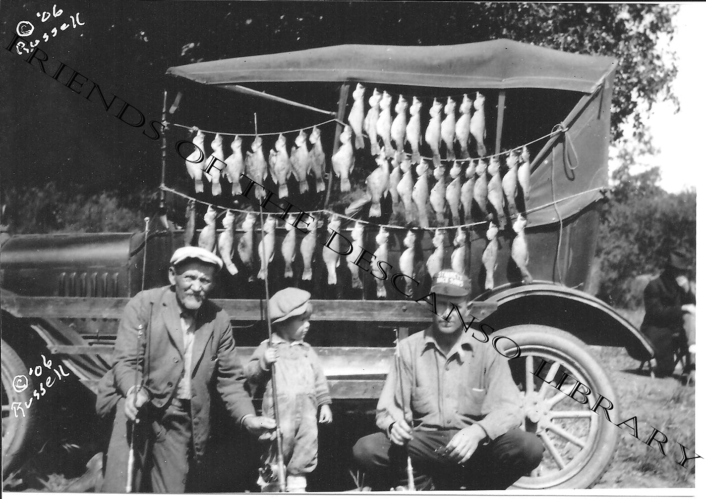 The Black Bass Catch at Lake Morina, 1923.Many other pictures of the same subject are available. Left to right, Mr. Heckler, Don Russell, Lewis F. Russell.