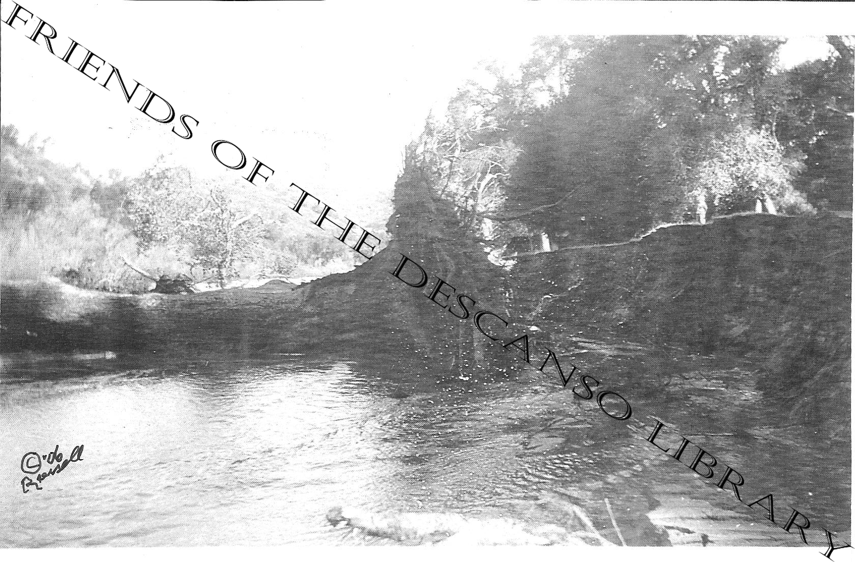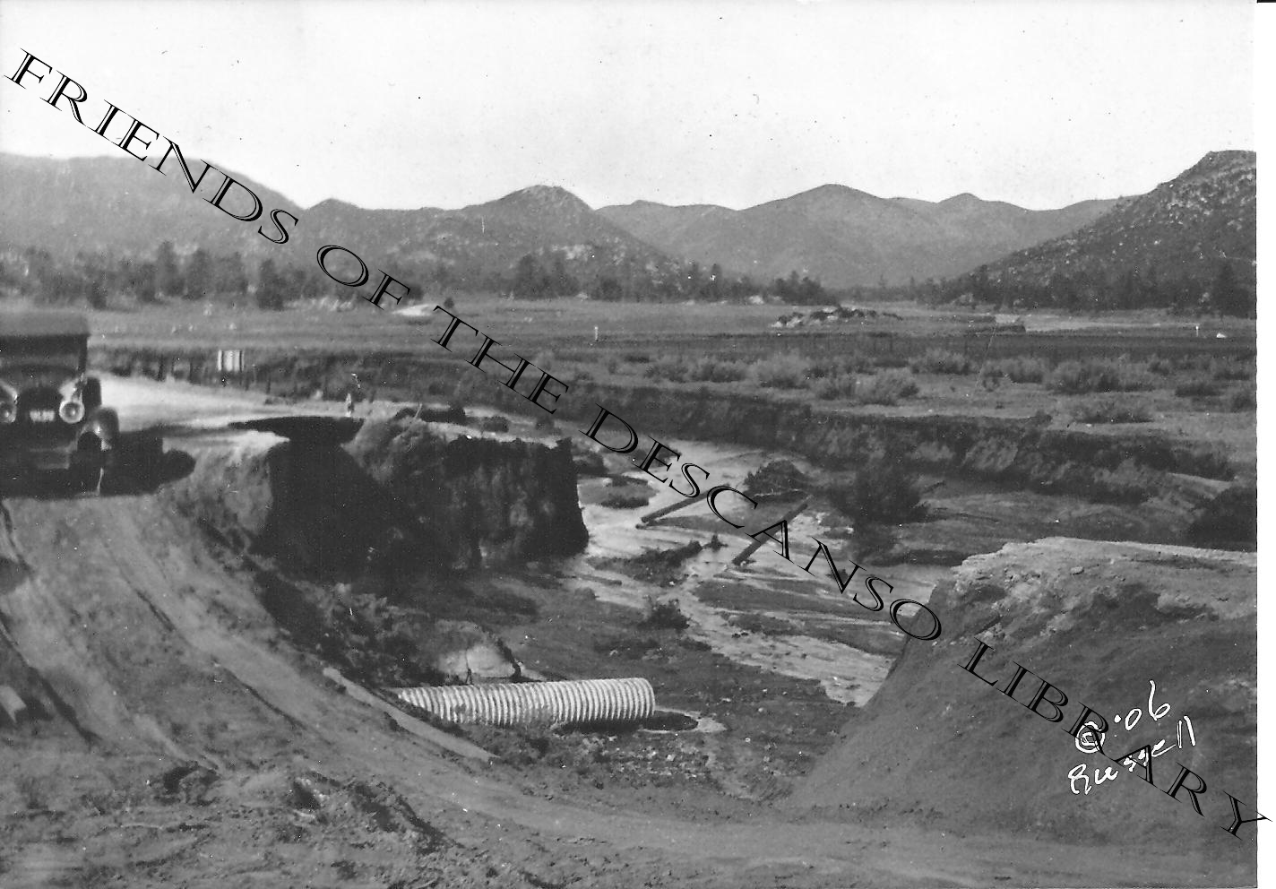 Result of the February, 1927 flood in Pine Creek. The picture was taken from old Highway 80 northwest of Pine Valley. The winters of 1926-27 had unusually large snowfalls and spring rains