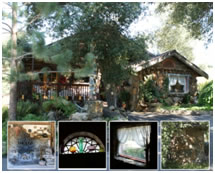 L. & D. Kennedy Rock House, 1922. Built by Peter Jacobs as a clubhouse for residents of Descanso Park. It is thought to have the first telephone installed in Descanso Park and still has an original junction box with wires that led out to nearby houses. Insets: 1. an unusual art glass window. 2 Jacobs mantle.